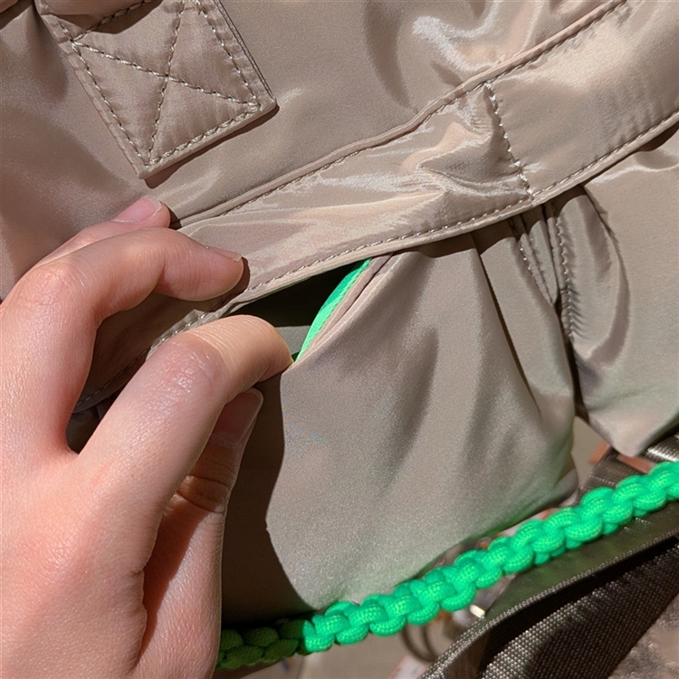 ミニマルフォルムに光沢感のあるナイロンとネオンカラーが映えるバッグとなっている。