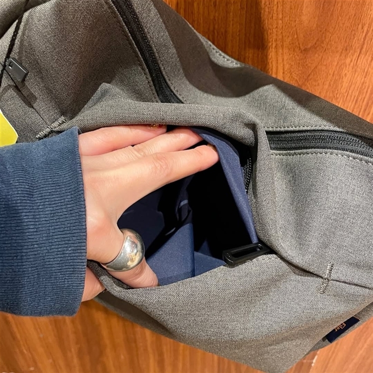 フロント・背面ともにジッパーポケットが一つずつ付いているので、スマホや鍵などすぐに取り出したいものの収納にとっても便利。